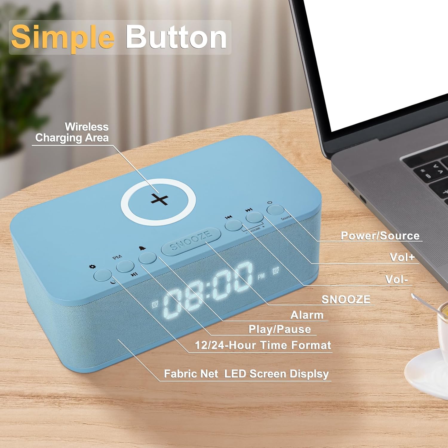 Alarm Clocks Large Snooze Button, Digital Clock USB Charger Port, Bluetooth Speaker Alarm Clock Bedroom AUX USB Bluetooth Speaker Wireless Charging 12/24H Dual Alarms Snooze Dimmer Sleep Timer, Blue
