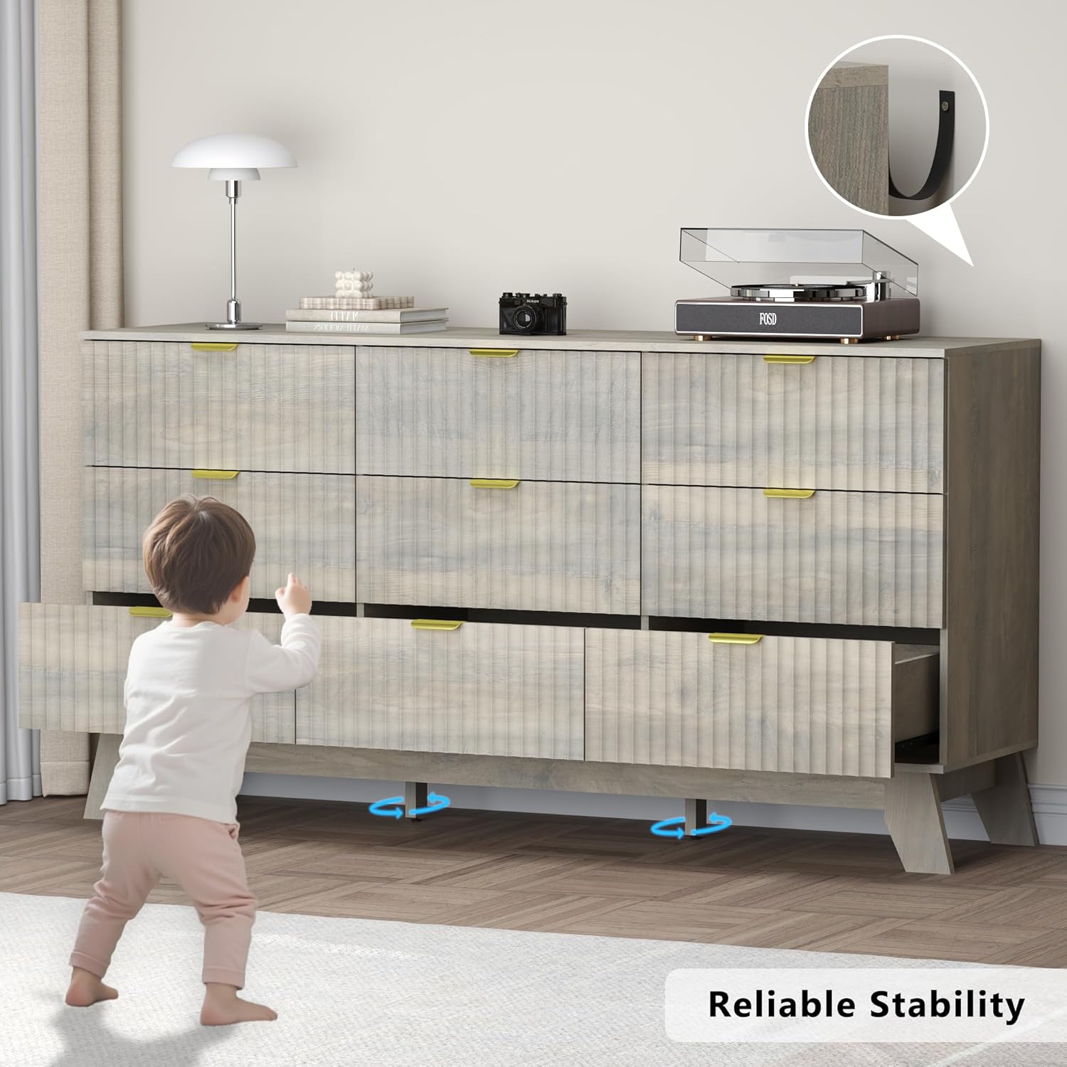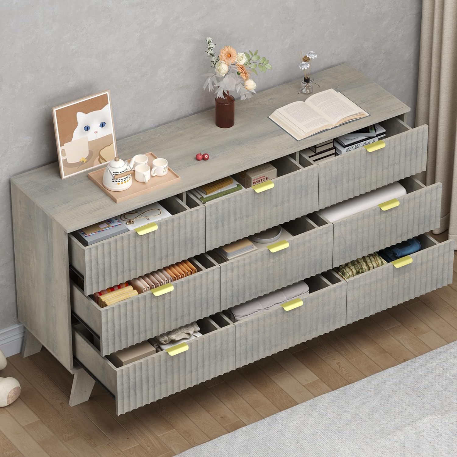 Fluted 9 Drawer Dresser, 57.1" Wide Modern Boho Chest of Drawers, Wooden Storage Dresser TV Stand for Bedroom, Living Room, Closet, Hallway, Curved Profile Design