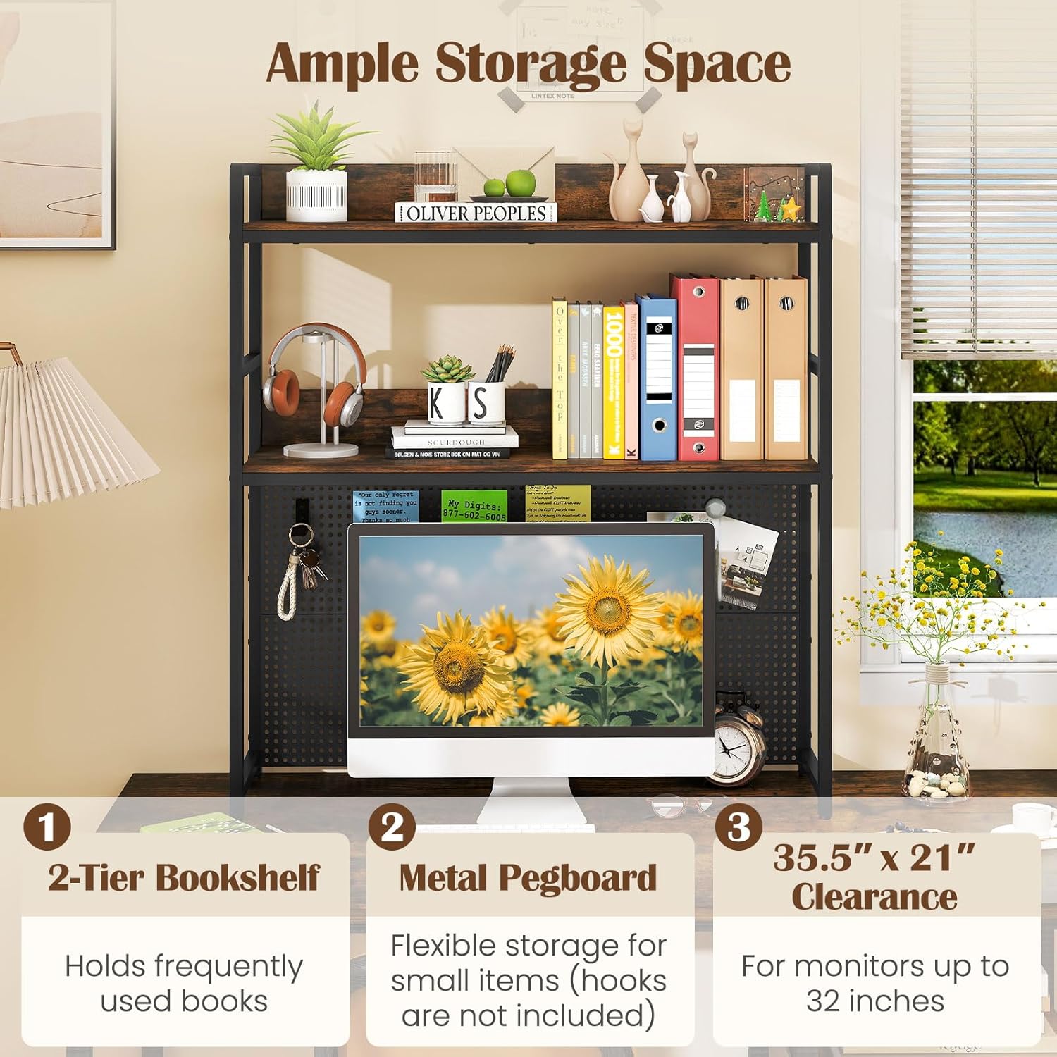 Giantex Desktop Bookshelf, 2-Tier Desk Hutch Dorm with Pegboard for up to 32" Computer Monitor, Industrial Countertop Storage Organizer Rack, Desk Shelf for Home Office, Rustic Brown