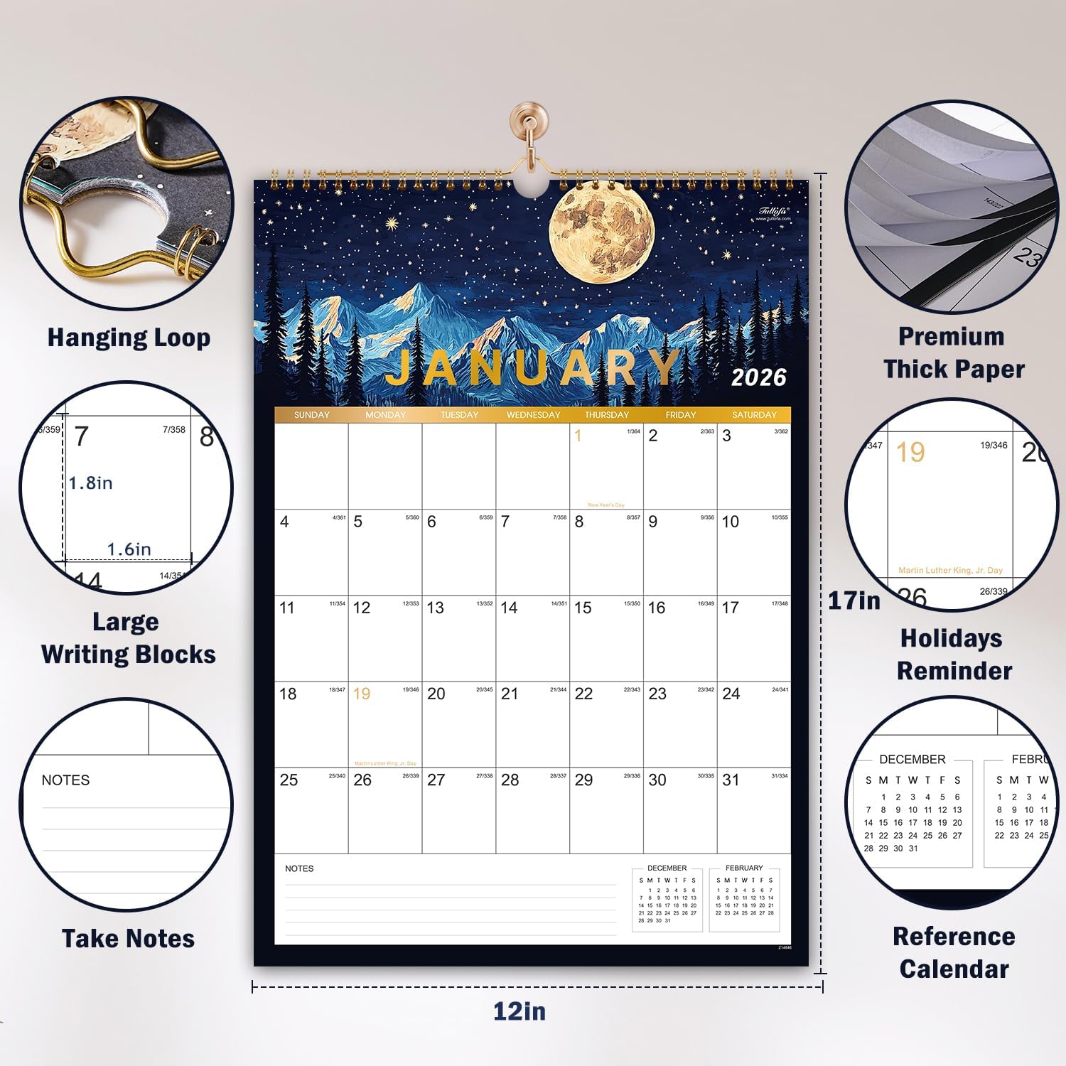 - 🌲 GUARANTEED QUALITY - Pages thicker than the most wall calendars in the market to reduce bleeding, erase fraying and shade issues. The large, ruled daily blocks in this 2026 wall calendar provide plenty of writing space. Bright white paper to create clean writing space and this 2026 wall calednar 12 month is printed with high quality and well-balanced color ink.