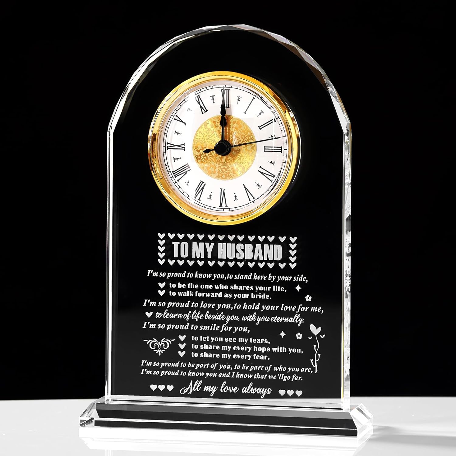 - Husband Gifts:This is a unique Husband gift of a crystal glass clock, engraved with many phrases that carry beautiful meanings. It is the perfect gift to give to Husband.