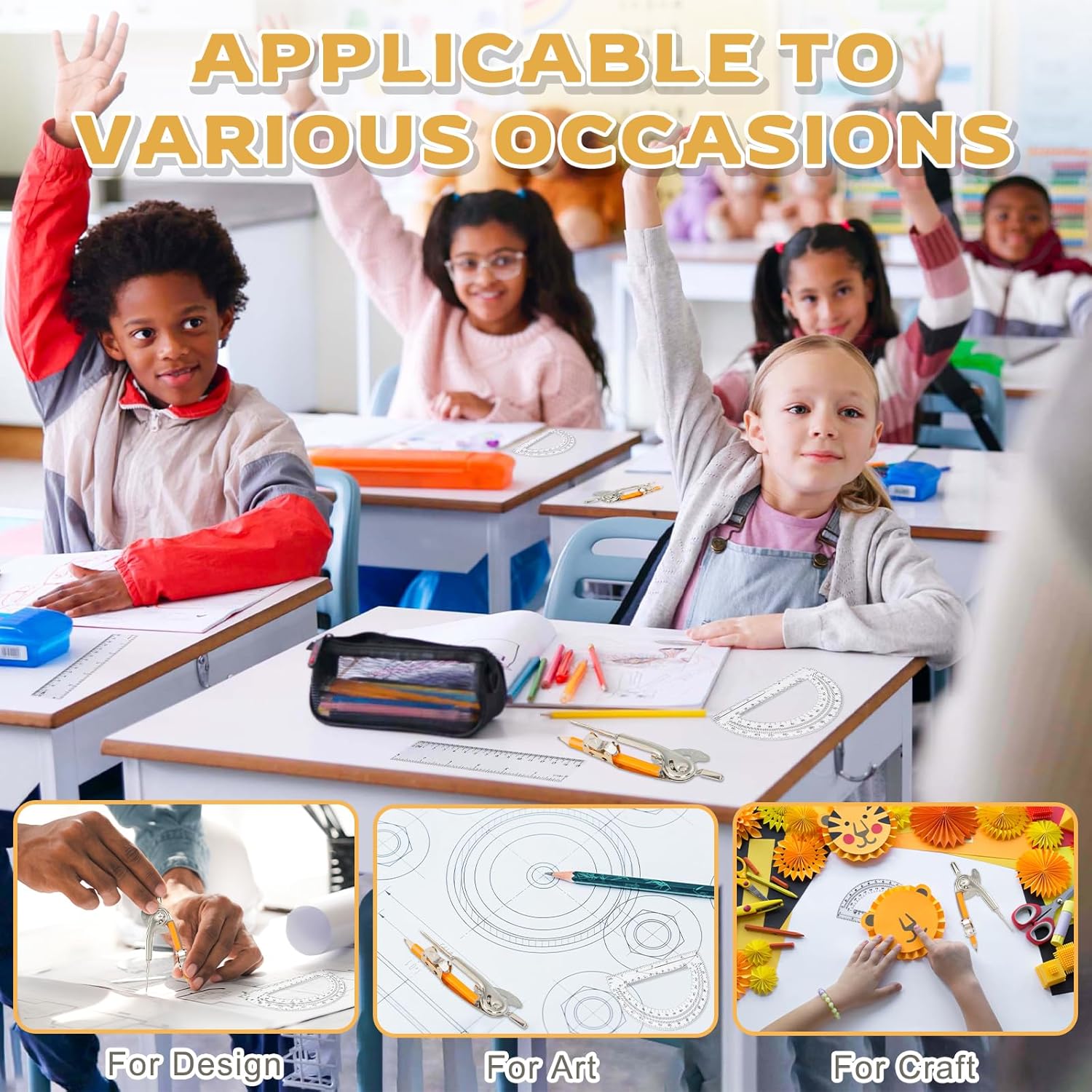 - High Quality Material: math compass bulk is made of high-quality metal, sturdy and durable, not easy to break or deform; the clear protractor and ruler are made of high-quality plastic, with clear scales, fewer scratches, and are sturdy and durable, transparent design can see the content of the page, which helps you to easily measure, for your study or work to bring convenience