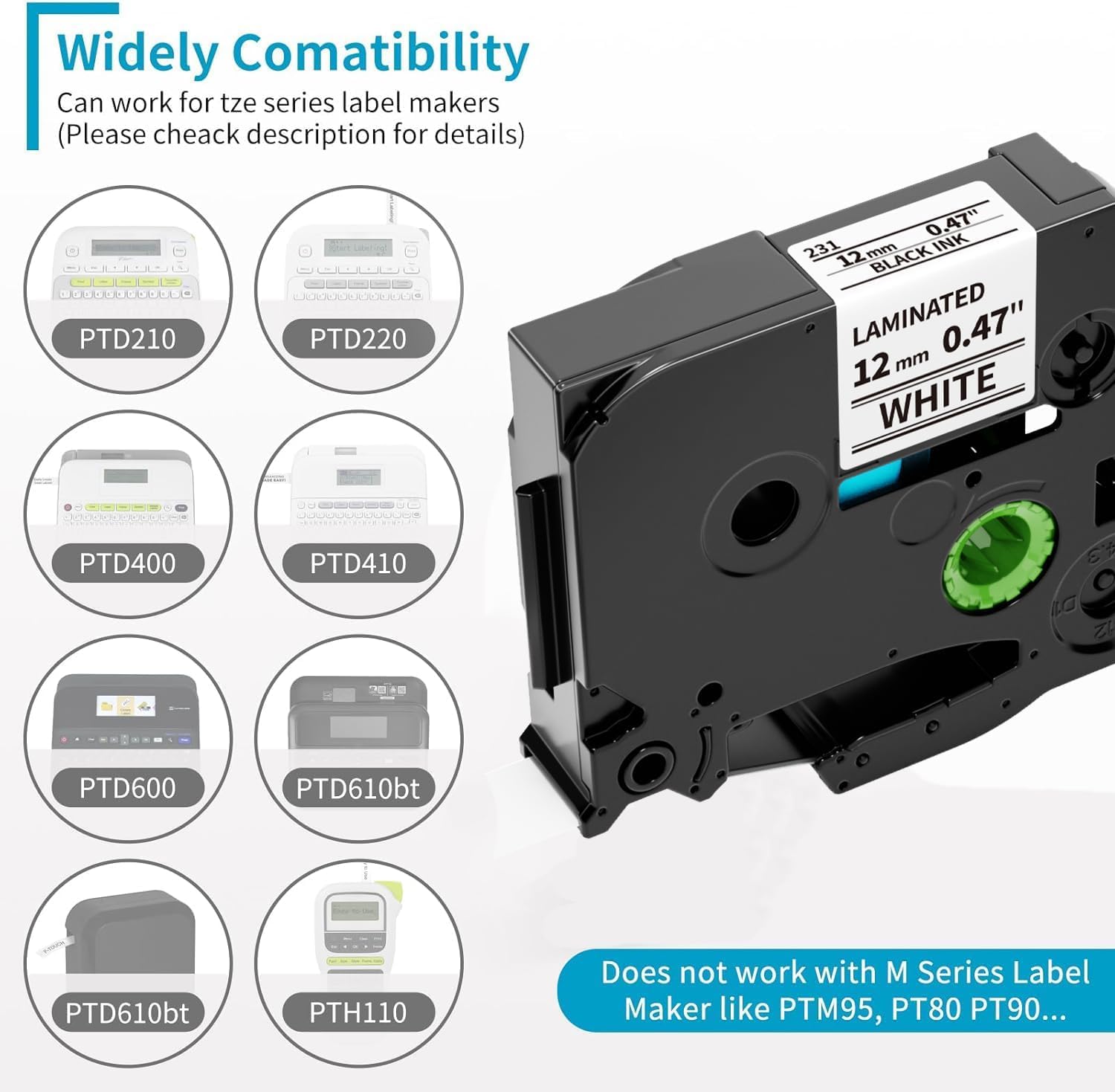 - [ Size ]: 12 millimeter (0.47 inch) x 26.2 feet (8 meter)/Pack, 6-Pack Replacement for TZe-231 TZe231 p-touch black print on white tape 1/2 cartridges;Please note that this is 12mm label tape