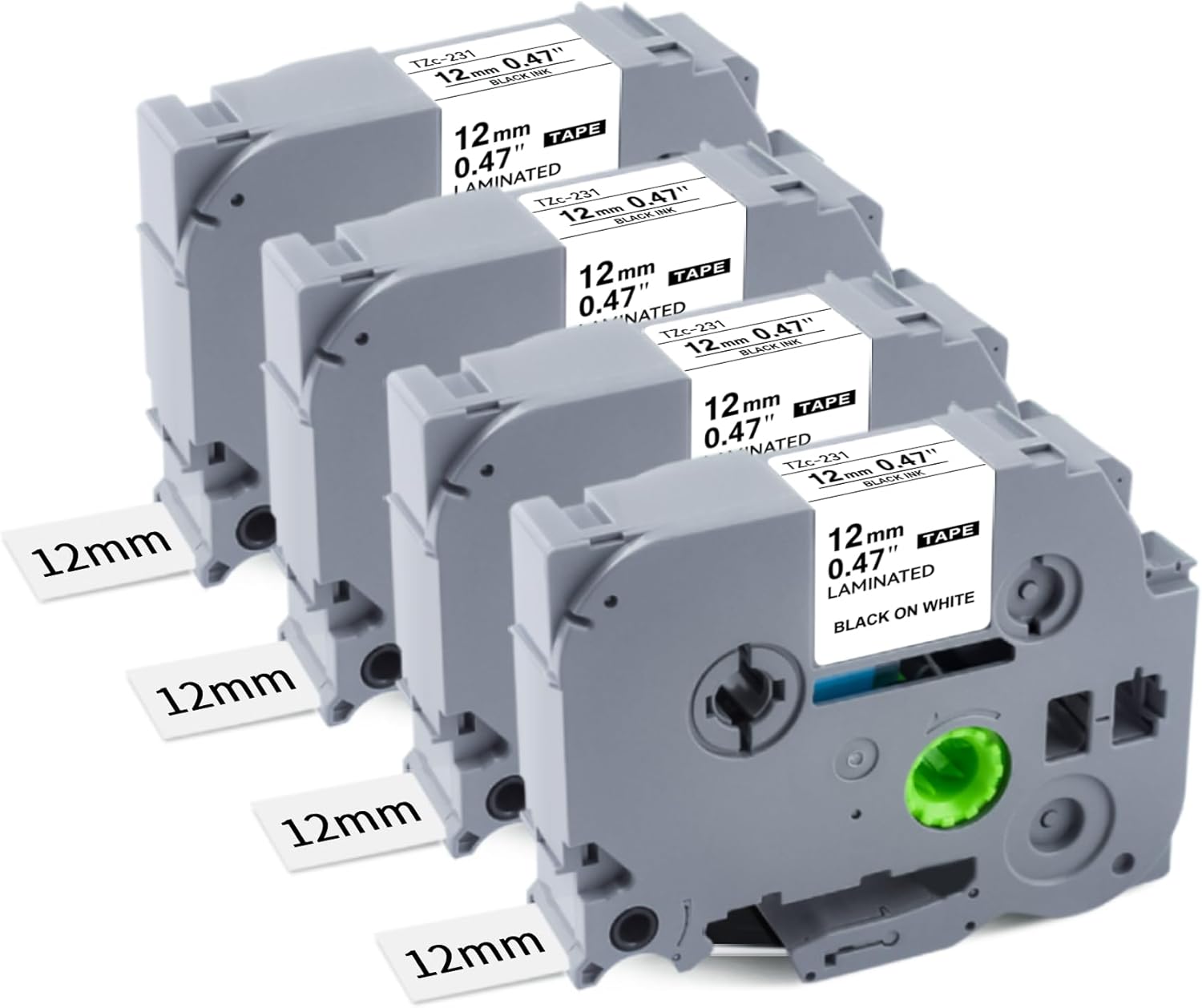 4Pk Tze-231 Label Maker Tapes Replacement for Brother P Touch Label Tape 12mm 0.47 Laminated White TZe231/TZe-231 for Brother PT-D210 D400 H103W H110 1280 1290 1880 2040, Black on White