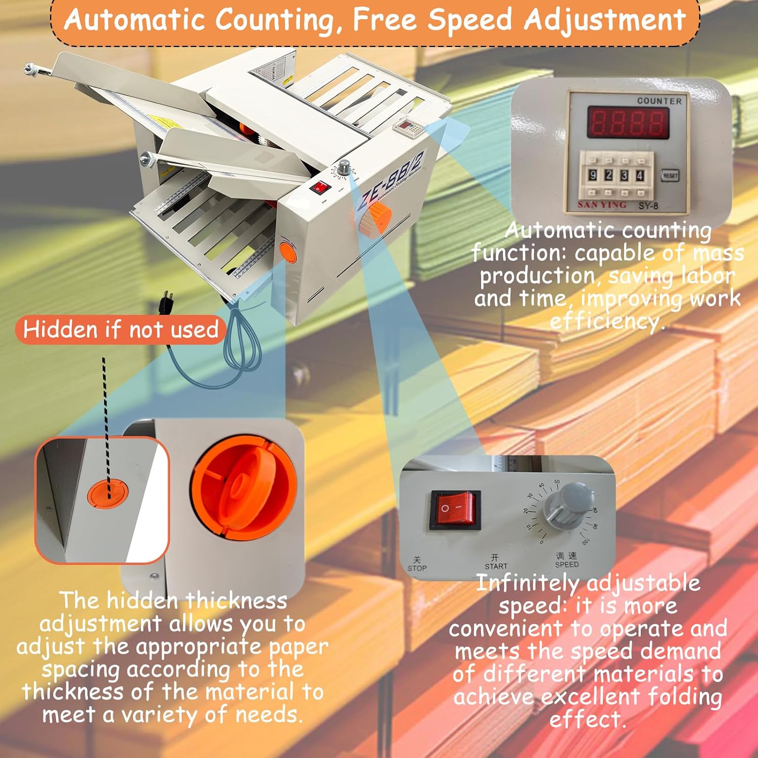 - Precise Control & High Efficiency: The folding machine is equipped with an infinitely variable speed regulator that can be adapted to any task, as well as a digital counter that allows for the precise setting of the number of sheets (e.g., 10/20 sheets folded). The combination of high grip rubber rollers minimizes paper jams